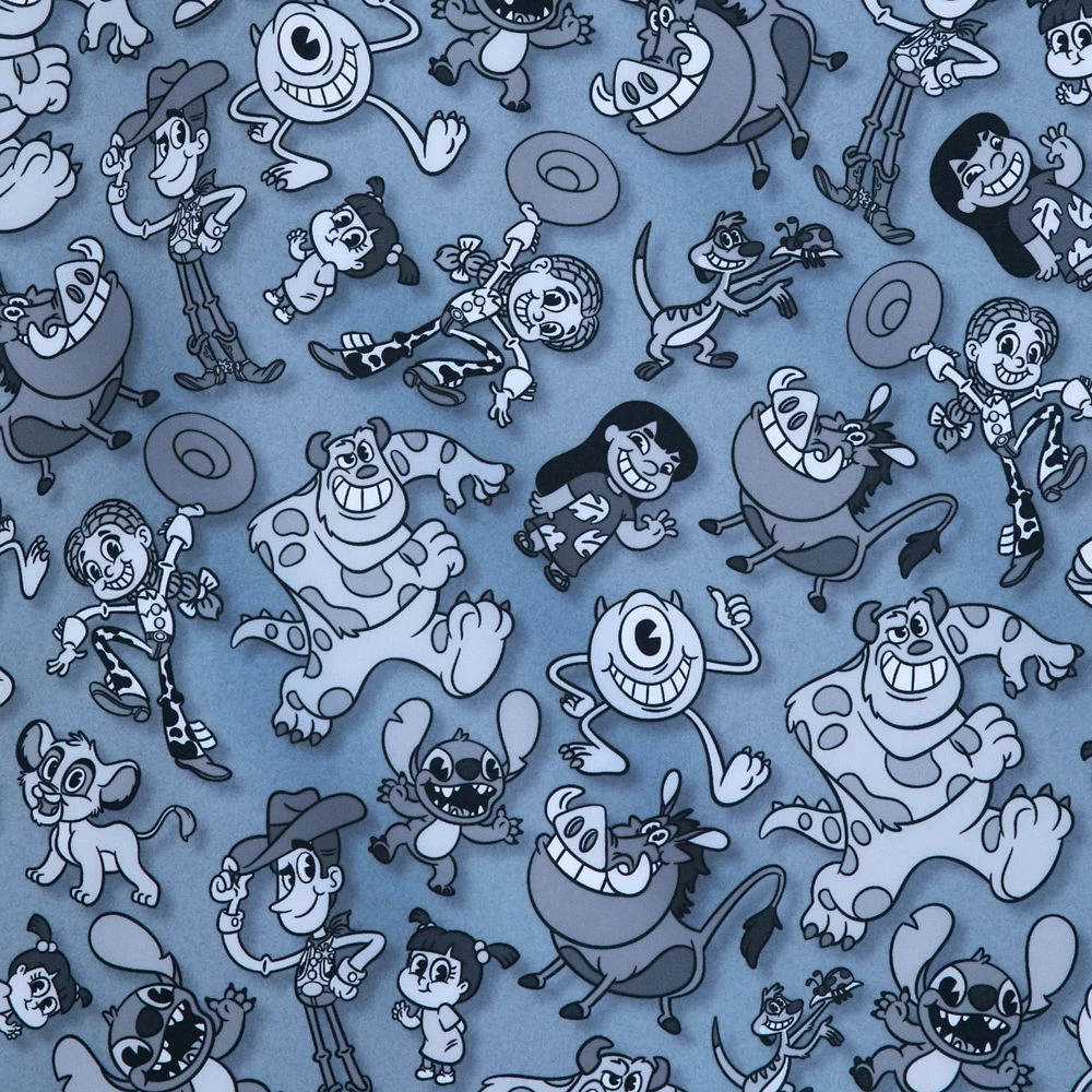 - Allover pattern features Stitch, Lilo, Simba, Timon, Pumbaa, Woody, Buzz Lightyear, Jessie, Mike, Sulley, and Boo