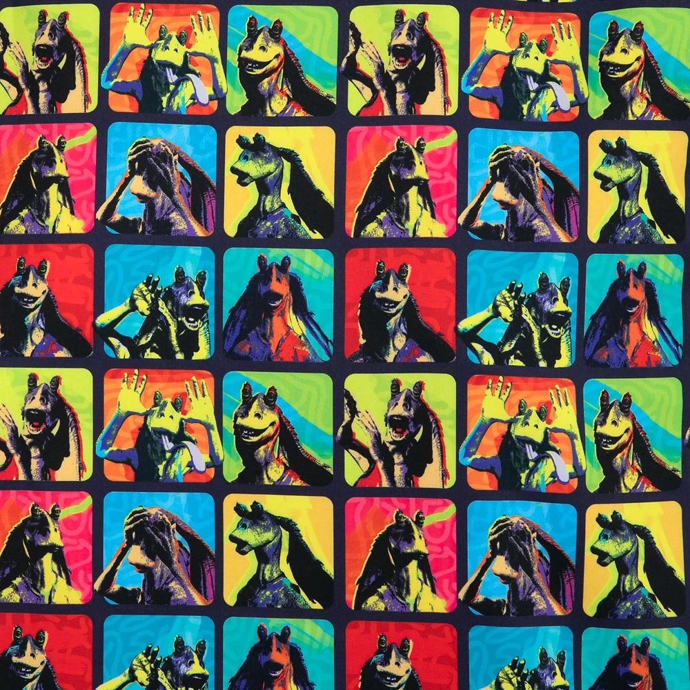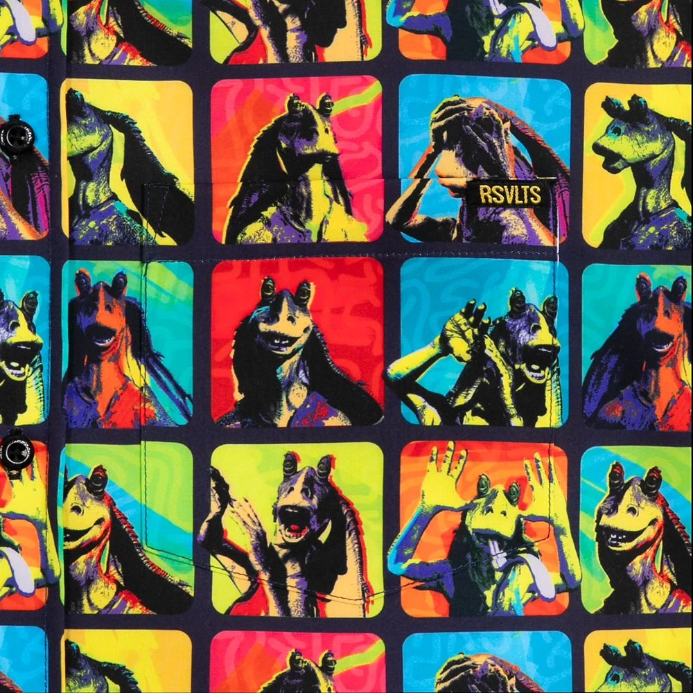 One of the most controversial Star Wars characters, Jar Jar Binks is celebrated in pop art style in the allover print on this shirt by RSVLTS. Made with their signature KUNUFLEX™ four-way stretch fabric, it features a colorful screen art design of Jar Jar who first appeared in Episode 1: The Phantom Menace. This striking shirt, which features classic details like a full button front, button collar and shirttail hem, will inspire cries of ”Ooh, mooey mooey, I love you!”