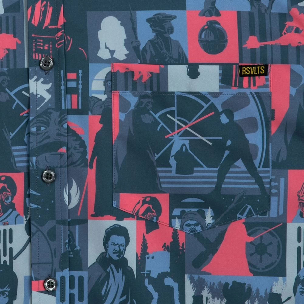 One classic inspires another with this Star Wars ”Trilogy’s End” KUNUFLEX™ shirt by RSVLTS. Inspired by Star Wars: Return of the Jedi, the dramatic allover pattern features key moments and characters from the epic film including Luke Skywalker, Lando Calrissian, Darth Vader, Boba Fett and others. Classically styled with a button collar, button front and a shirttail hem, this short sleeve shirt is as comfortable as it is stylish. Like the film that inspired it, it’s destined to be an all-time favorite.